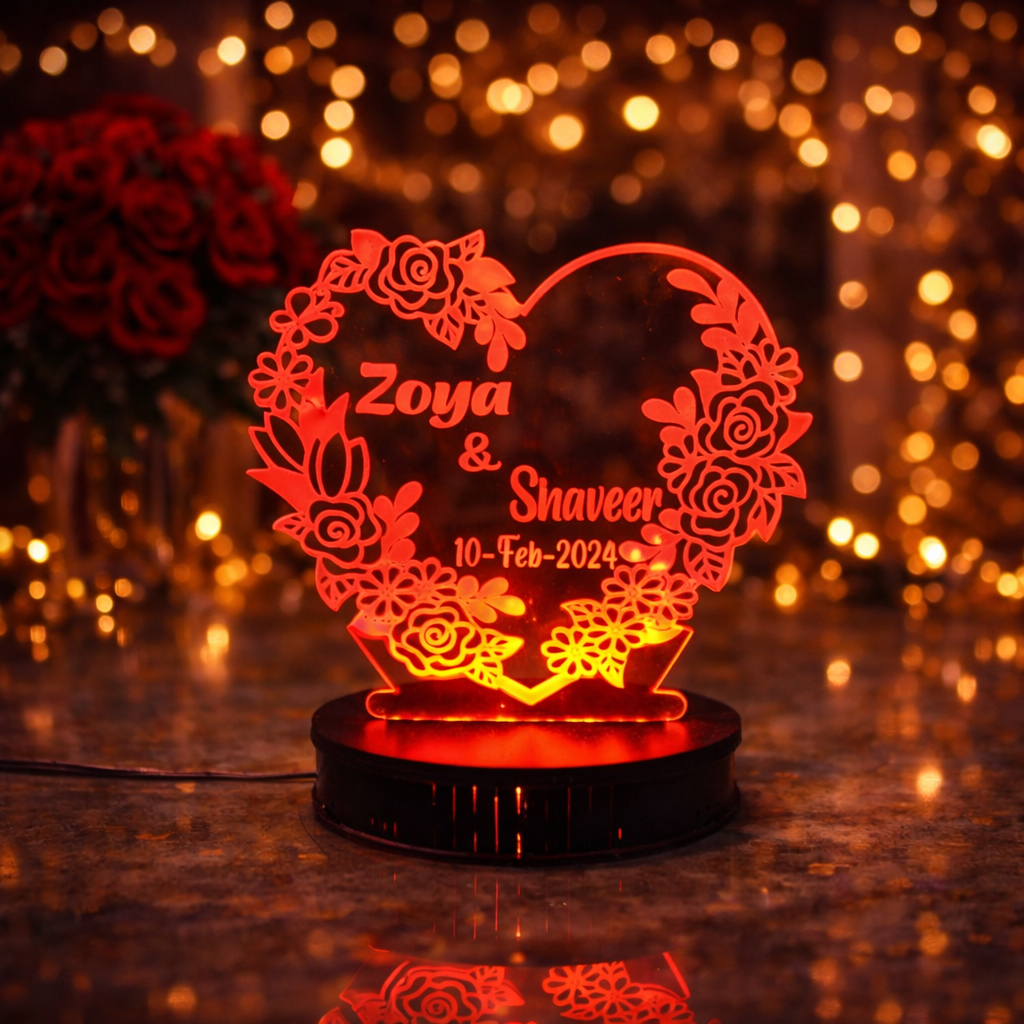 The Custom Floral Heart 3D LED Name Lamp combines a beautiful heart-shaped floral frame with personalized names and special date. The stunning 3D illusion effect creates a magical glow that enhances any romantic setting.