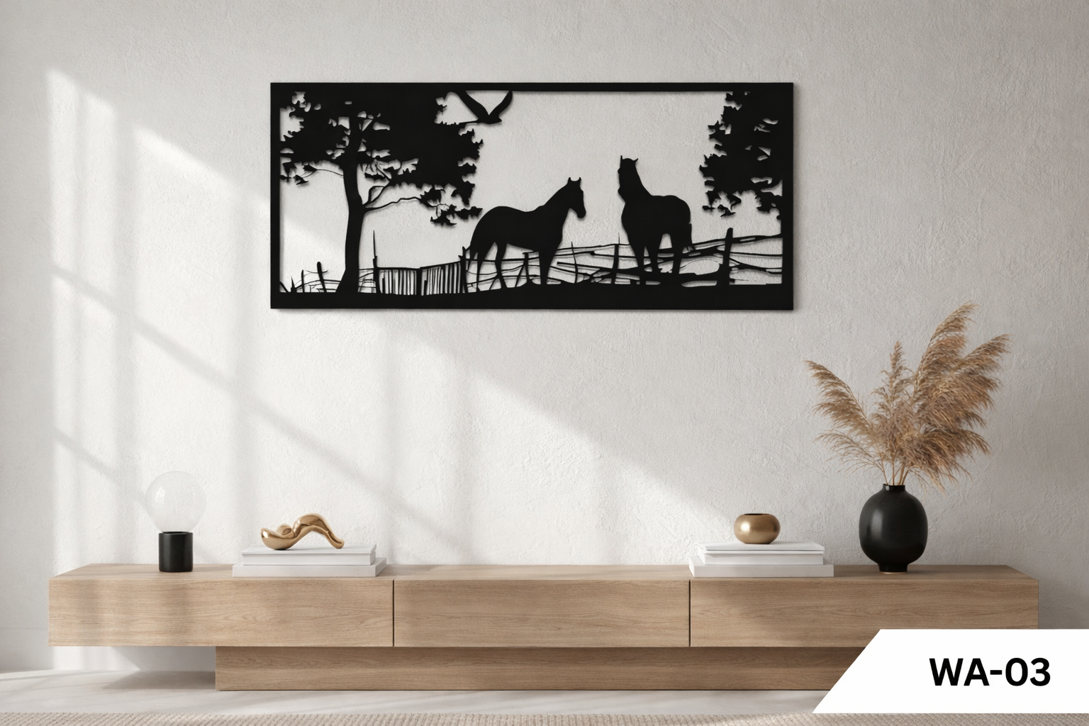 Add a touch of nature, freedom, and elegance to your home with this stunning Horse Silhouette Wall Art (WA-03).